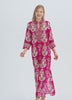 The Elise Caftan blends effortless elegance with flattering comfort. The 3/4 sleeves and elongated silhouette offer an easy, graceful drape, while side slits and a split high collar add modern femininity and movement. Crafted in silky viscose, this classic is in our newest Ikat print in shades of cranberry and fern and moss greens with a touch of rose on an off white ground.